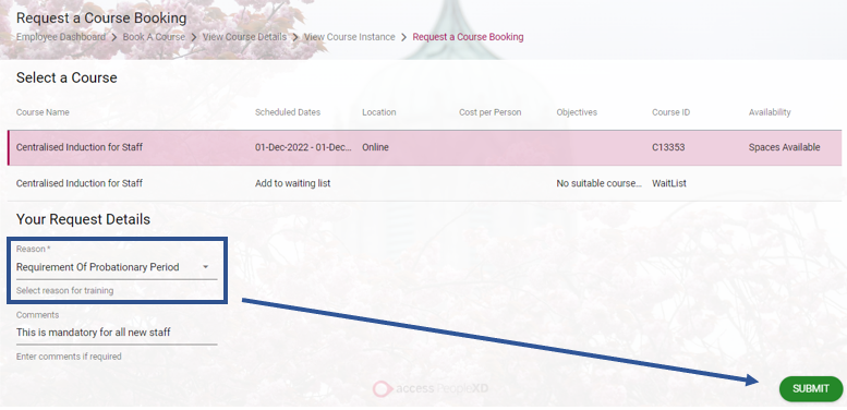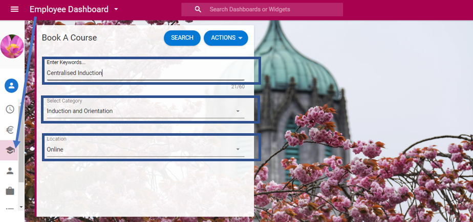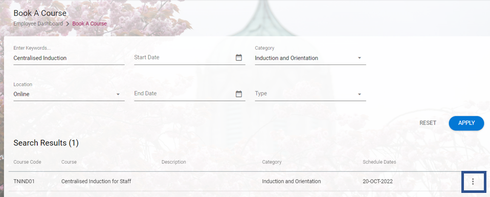 3. Chun clárú ar cheardlann ar leith cliceáil ar na 3 phonc faoin mbosca gorm agus roghnaigh 'Iarr freastal ar an gcúrsa' ón mbosca anuas